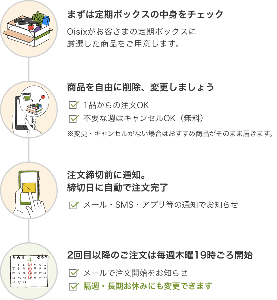 Oisixがお選びします登録いただいた定期プランごとに、お客さまのお好みに合った食材をお選びします。お選びした食材は毎週木曜日に定期ボックス(お買い物かご)にご用意します。