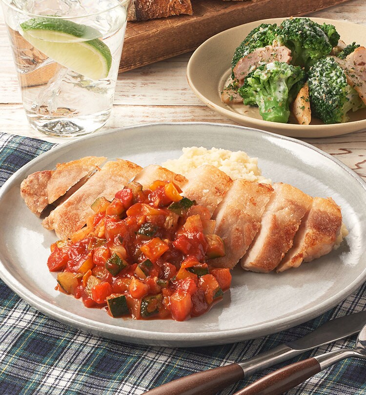 香ばしく焼いたポークソテーに具材感のある野菜ソースをかけた、食べ応えのある一品です。ベーコンの旨みとハーブの香りの組み合わせがおいしいブロッコリーの副菜を組み合わせて。