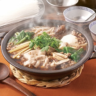山椒をベースに加えたスープの爽やかな香りと、立ち上る五香粉の匂いが台湾を彷彿とさせる、異なる豚肉の部位を巧みに使ったお鍋。食材をほおばった時の香りとほのかな痺れをお楽しみください。