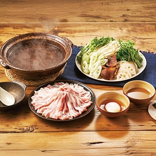 とろり温玉がおいしい八方だれと、濃厚ごまだれの2種類のたれを、豚バラ肉と6種野菜をしゃぶしゃぶして最後まで飽きずに味わえる仕立てです。〆は残った出汁にのりとわさびを溶かし入れ、ほっこり味の雑炊を楽しんで。