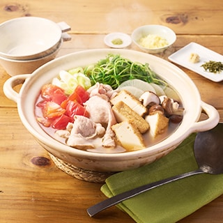 お出汁にトマトのまろやかな酸味と旨みが溶け込んだ和風トマト鍋。豚肉と野菜がスープに深みを加え、ほっとする味わいに仕上げました。粉チーズで旨みとコクを、山椒でさわやかな香りとともに味の変化も楽しめます。〆はスープで出汁茶漬け。のりと山わさびでさっぱりと、最後までおいしくお召し上がりいただけます。