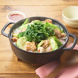 キャベツの存在感溢れるコンソメ仕立ての鍋に、じゃがいもやスナップえんどうも加えました。こんがり焼いた鶏肉や鶏団子も入って、食べ応えも◎。味の変化はピリ辛テイストのチリトマト風味を楽しんで。〆は洋風おじやで、春の味わいを食べ尽くして!