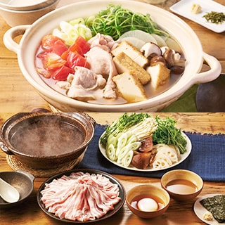 ■原材料 : ■6種野菜のだししゃぶ鍋:豚バラ肉(千葉県)、鶏卵(国産)、えのき(国産)、豆苗(国産)、長ねぎ(国産)、フリルレタス(国産)、八方だれ(醤油(国内製造)、みりん、砂糖、穀物酢、食塩、鰹エキス、酵母エキス、昆布エキス、(一部に小麦・大豆を含む))、生きくらげ(国産)、れんこん(国産)、出汁の素(醤油(小麦・大豆を含む)(国内製造)、鰹節エキス、食塩、砂糖、さば節だし(さばを含む)、醸造酢、昆布だし、酵母エキス、昆布エキス、鰹だし、鰹節粉末、あごだし)、ごま味噌だれ(味噌(国内製造)、ごま、砂糖、清酒、発酵調味料、醤油、(一部に小麦・ごま・大豆を含む))、ねりごま、加工わさび(西洋わさび(北海道)、植物油脂、醸造酢/ビタミンC)、味のり(乾のり(国産)、醤油風調味料(そら豆、食塩)、砂糖、黒砂糖、食塩、昆布、味醂、鰹節、乾椎茸、帆立煮汁、乾唐辛子) ■だしを味わう和風トマト鍋:豚切り落とし肉(千葉県)、絹厚揚げ(大豆(国産)、植物油/凝固剤((塩化マグネシウム)「にがり」))、トマト(国産)、寄せ鍋の素(醤油(国内製造)、鰹節エキス、砂糖、食塩、醸造酢、いりこ粉末、むろ鯵粉末、昆布エキス、鰹だし、昆布だし、あごだし粉末、(一部に小麦・大豆を含む))、豆苗(国産)、大根(国産)、長ねぎ(国産)、しいたけ(国産)、鶏ガラスープベース(チキンエキス、動物油脂、チキンブイヨン、食塩、酵母エキス、昆布エキス(一部に鶏肉を含む))、粉チーズ(ナチュラルチーズ(生乳、食塩)(ニュージーランド製造、オーストラリア製造))、沢わさび(西洋わさび(北海道)、植物油脂、醸造酢/ビタミンC)、きざみのり(焼海苔)、山椒粉(山椒(和歌山産ぶどう山椒))