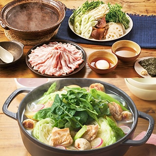 ■原材料 : ■6種野菜のだししゃぶ鍋:豚バラ肉(千葉県)、鶏卵(国産)、えのき(国産)、豆苗(国産)、長ねぎ(国産)、フリルレタス(国産)、八方だれ(醤油(国内製造)、みりん、砂糖、穀物酢、食塩、鰹エキス、酵母エキス、昆布エキス、(一部に小麦・大豆を含む))、生きくらげ(国産)、れんこん(国産)、出汁の素(醤油(小麦・大豆を含む)(国内製造)、鰹節エキス、食塩、砂糖、さば節だし(さばを含む)、醸造酢、昆布だし、酵母エキス、昆布エキス、鰹だし、鰹節粉末、あごだし)、ごま味噌だれ(味噌(国内製造)、ごま、砂糖、清酒、発酵調味料、醤油、(一部に小麦・ごま・大豆を含む))、ねりごま、加工わさび(西洋わさび(北海道)、植物油脂、醸造酢/ビタミンC)、味のり(乾のり(国産)、醤油風調味料(そら豆、食塩)、砂糖、黒砂糖、食塩、昆布、味醂、鰹節、乾椎茸、帆立煮汁、乾唐辛子) ■Wで味わう鶏肉のポトフ風鍋:鶏団子(鶏肉(国産)、玉ねぎ、牛脂肪、つなぎ(パン粉、でん粉)、豆腐、ワインタイプ発酵調味料、食塩、しょうが、乳清たん白、乾燥卵白、香辛料、(一部に卵・乳成分・小麦・牛肉・大豆・鶏肉を含む))、鶏もも肉(国産)、じゃがいも(国産)、キャベツ(国産)、コンソメスープの素(チキンエキス(国内製造)、食塩、砂糖、澱粉、玉葱、醸造酢、濃縮人参果汁、醤油(小麦・大豆を含む)、酵母エキス、セロリエキス、胡椒、パセリ)、玉ねぎ(国産)、スナップえんどう(国産)、トマトソース(トマト調味料(トマトペースト、食塩、水あめ、砂糖)(国内製造)、トマトペースト、水あめ、砂糖、オニオンソテー、食塩、にんにく、チキンブイヨン、食用植物油脂、香味食用油、醸造酢、香辛料、(一部に乳成分・鶏肉を含む))、ルッコラ(国産)、ラディッシュ(国産)、チリオイル(食用こめ油、食用風味油(食用植物油脂、唐辛子)/酸化防止剤(V.E))、チリパウダー(パプリカ、唐辛子、コリアンダー、クミン、オレガノ、ガーリック)