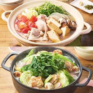 ■原材料 : ■だしを味わう和風トマト鍋:豚切り落とし肉(千葉県)、絹厚揚げ(大豆(国産)、植物油/凝固剤((塩化マグネシウム)「にがり」))、トマト(国産)、寄せ鍋の素(醤油(国内製造)、鰹節エキス、砂糖、食塩、醸造酢、いりこ粉末、むろ鯵粉末、昆布エキス、鰹だし、昆布だし、あごだし粉末、(一部に小麦・大豆を含む))、豆苗(国産)、大根(国産)、長ねぎ(国産)、しいたけ(国産)、鶏ガラスープベース(チキンエキス、動物油脂、チキンブイヨン、食塩、酵母エキス、昆布エキス(一部に鶏肉を含む))、粉チーズ(ナチュラルチーズ(生乳、食塩)(ニュージーランド製造、オーストラリア製造))、沢わさび(西洋わさび(北海道)、植物油脂、醸造酢/ビタミンC)、きざみのり(焼海苔)、山椒粉(山椒(和歌山産ぶどう山椒)) ■Wで味わう鶏肉のポトフ風鍋:鶏団子(鶏肉(国産)、玉ねぎ、牛脂肪、つなぎ(パン粉、でん粉)、豆腐、ワインタイプ発酵調味料、食塩、しょうが、乳清たん白、乾燥卵白、香辛料、(一部に卵・乳成分・小麦・牛肉・大豆・鶏肉を含む))、鶏もも肉(国産)、じゃがいも(国産)、キャベツ(国産)、コンソメスープの素(チキンエキス(国内製造)、食塩、砂糖、澱粉、玉葱、醸造酢、濃縮人参果汁、醤油(小麦・大豆を含む)、酵母エキス、セロリエキス、胡椒、パセリ)、玉ねぎ(国産)、スナップえんどう(国産)、トマトソース(トマト調味料(トマトペースト、食塩、水あめ、砂糖)(国内製造)、トマトペースト、水あめ、砂糖、オニオンソテー、食塩、にんにく、チキンブイヨン、食用植物油脂、香味食用油、醸造酢、香辛料、(一部に乳成分・鶏肉を含む))、ルッコラ(国産)、ラディッシュ(国産)、チリオイル(食用こめ油、食用風味油(食用植物油脂、唐辛子)/酸化防止剤(V.E))、チリパウダー(パプリカ、唐辛子、コリアンダー、クミン、オレガノ、ガーリック)