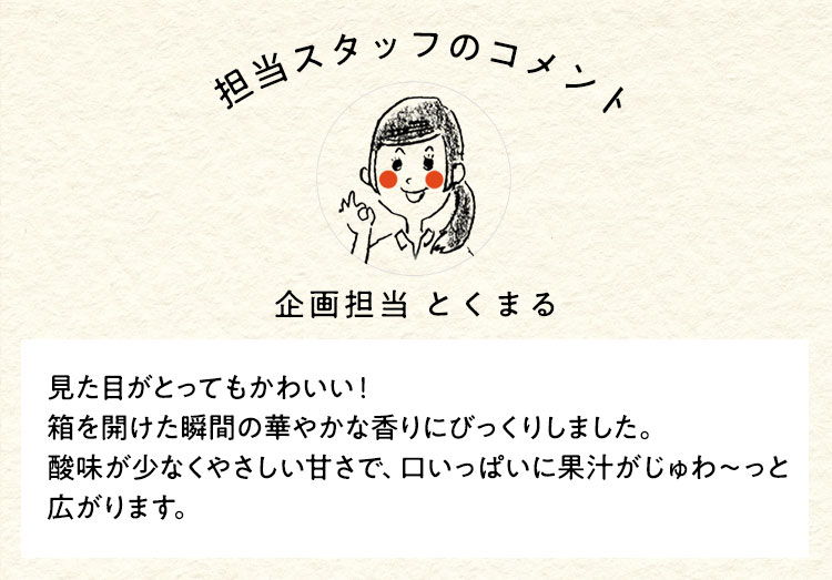見た目がとってもかわいい!箱を開けた瞬間の華やかな香りにびっくりしました。酸味が少なくやさしい甘さで、口いっぱいに果汁がじゅわ〜っと広がります。