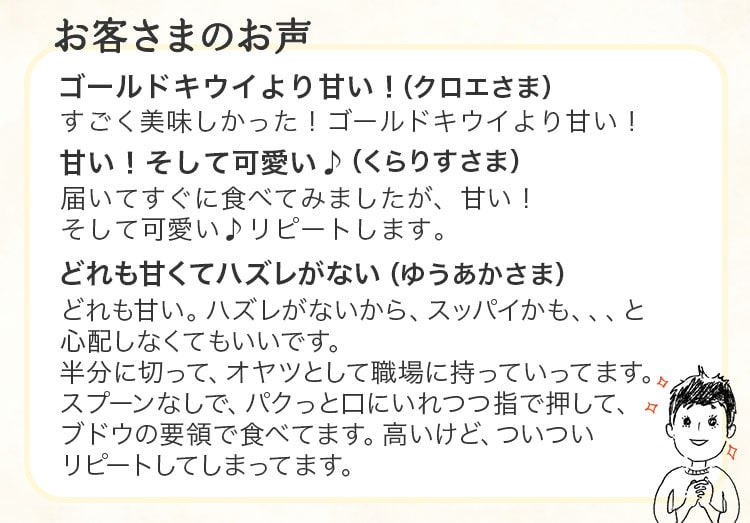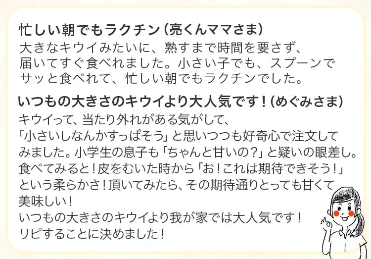 大きなキウイみたいに、熟すまで時間を要さず、届いてすぐ食べれました。小さい子でも、スプーンでサッと食べれて、忙しい朝でもラクチンでした。