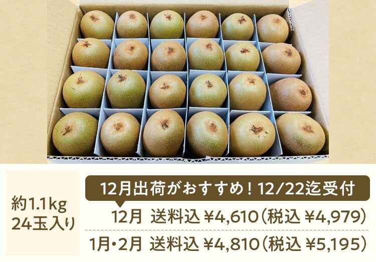 ていねいにていねいに収穫したキウイは、果実同士があたって傷がついたり、へこみができないように、オリジナルの箱に小分けにしてお届けします。箱を開けたときのワクワク感もお楽しみください。約1.1kgの24玉をお届けします。品質そのまま、12月出荷分のみ価格が異なります。
