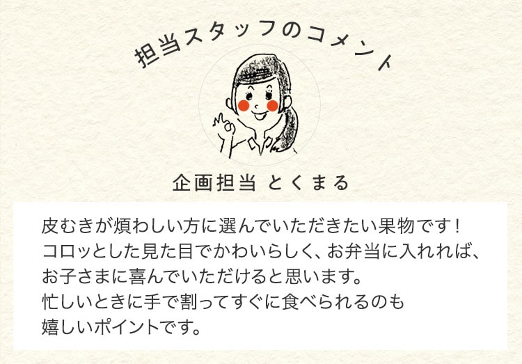 皮むきが煩わしい方に選んでいただきたい果物です!コロッとした見た目でかわいらしく、お弁当に入れれば、お子さまに喜んでいただけると思います。忙しいときに手で割ってすぐに食べられるのも嬉しいポイントです。