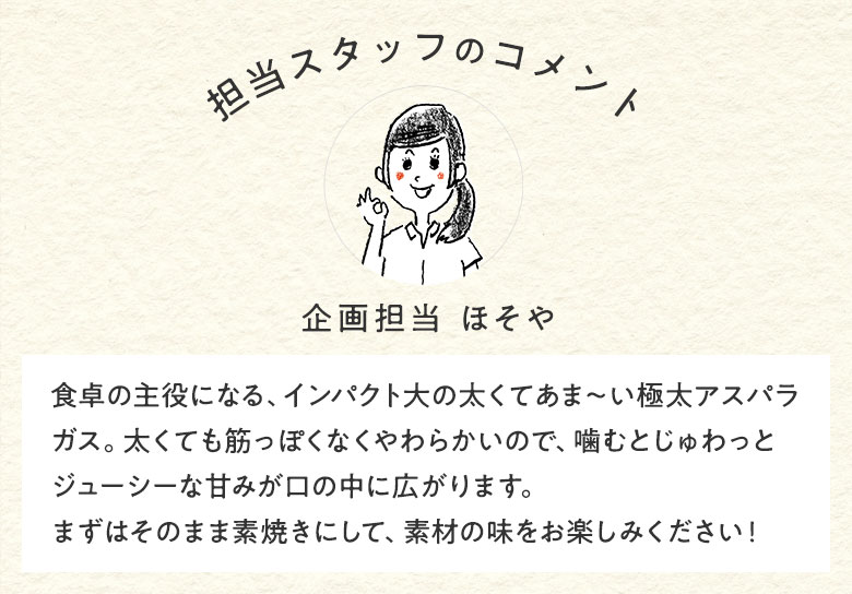 食卓の主役になる、インパクト大の太くてあま〜い極太アスパラガス。太くても筋っぽくなくやわらかいので、噛むとじゅわっとジューシーな甘みが口の中に広がります。まずはそのまま素焼きにして、素材の味をお楽しみください!