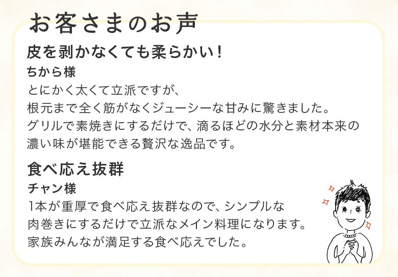 - 皮を剥かなくても柔らかい!とにかく太くて立派ですが、根元まで全く筋がなくジューシーな甘みに驚きました。