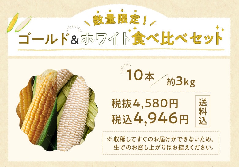 食べ比べセットは収穫タイミングが異なる黄・白の実を組み合わせてお届けするため、どうしても収穫からお届けまでに日数が経過してしまいます。必ず加熱してからお召し上がりください。もぎたての「生」でかじる感動を味わいたい方は、黄・白それぞれ単品(5本入り・10本入り)でのご購入をおすすめしております。