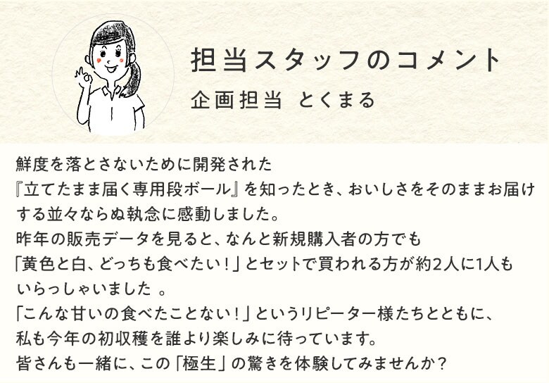 昨年の販売データを見ると、なんと新規購入者の方でも「黄色と白、どっちも食べたい!」とセットで買われる方が約2人に1人もいらっしゃいました 。