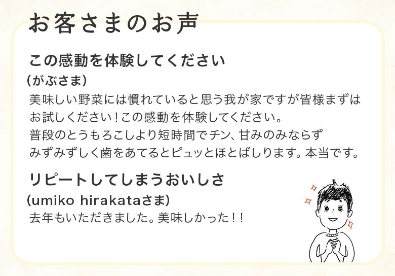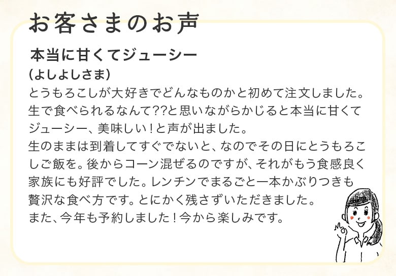 とうもろこしが大好きでどんなものかと初めて注文しました。生で食べられるなんて??と思いながらかじると本当に甘くてジューシー、美味しい!と声が出ました。生のままは到着してすぐでないと、なのでその日にとうもろこしご飯を。後からコーン混ぜるのですが、それがもう食感良く家族にも好評でした。レンチンでまるごと一本かぶりつきも贅沢な食べ方です。とにかく残さずいただきました。また、今年も予約しました!今から楽しみです。