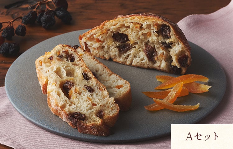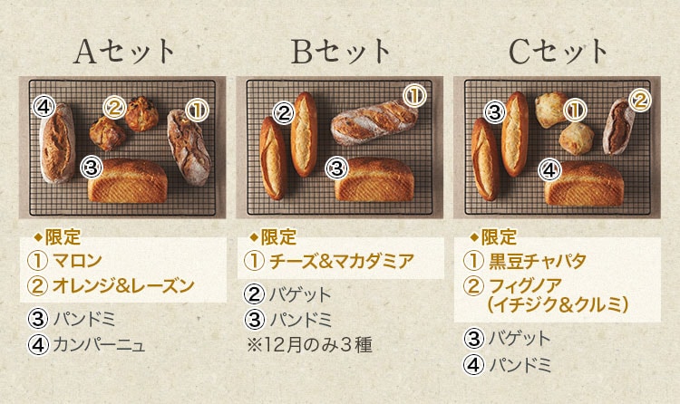 ■セット内容 : パン・ド・ミ 1個(約320g)、カンパーニュ 1個、マロン 1個、オレンジ&レーズン 2個