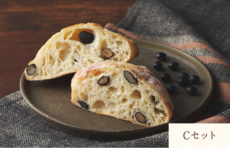 ■セット内容 : パン・ド・ミ 1個(約320g)、バゲット 2個、黒豆チャパタ 2個、イチジク&クルミ 1個