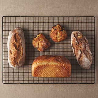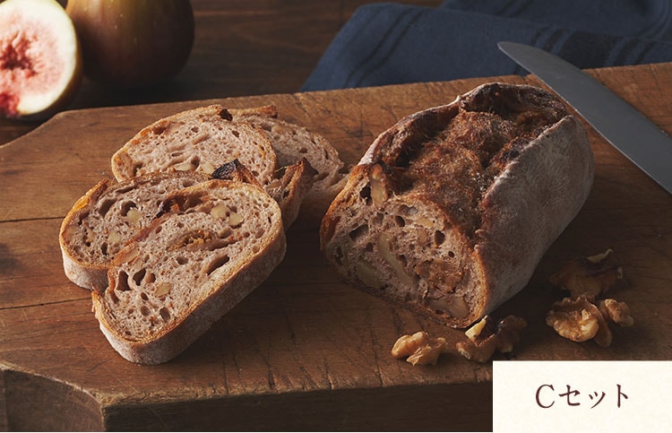 赤ワインで丁寧に煮たイチジクと香ばしいクルミを加え、3種の小麦粉とライ麦を配合した生地で焼き上げました。深みのある甘みとコクが広がる味わいで、薄くスライスして白カビ系やクリーミーなチーズと合わせれば、ワインのおつまみにもおすすめです。