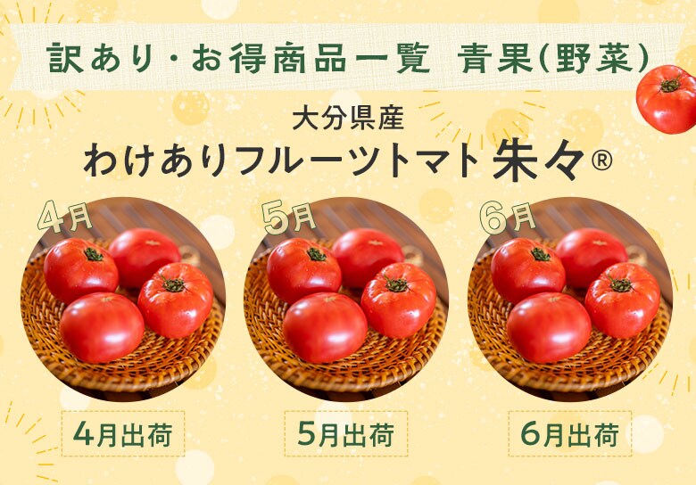 大分県産「朱々(R)」の中でも、少しだけ亀裂が入ったりヘタが取れてしまったものを集めました。フルーツトマトならではの、喉が鳴るような甘みと旨みのバランスをお楽しみいただけます。サラダはもちろん、サッと火を通せばさらに甘みが引き立ちます。