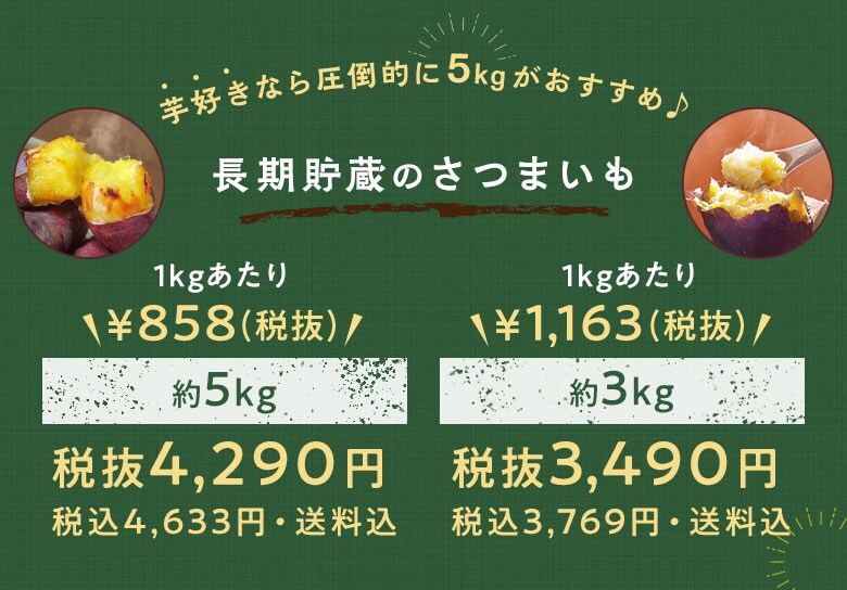 3kgも昨年販売時よりもお求めやすくしました。長持ちしやすい泥付きでお届けしますが、冷凍焼き芋にして保存してもおいしくお召し上がりいただけます。