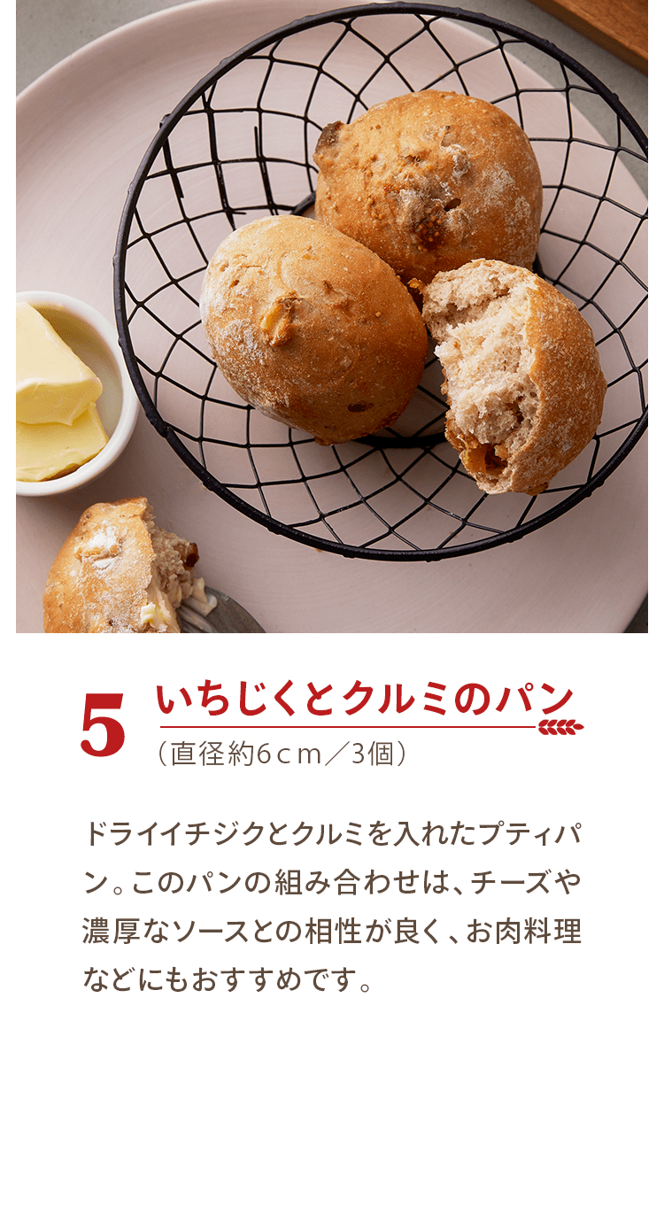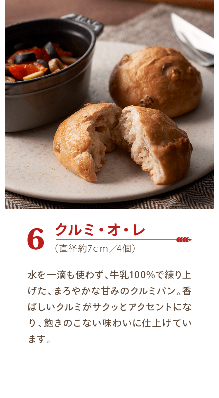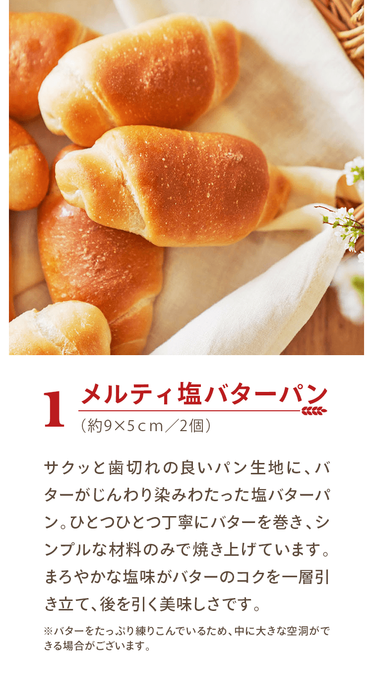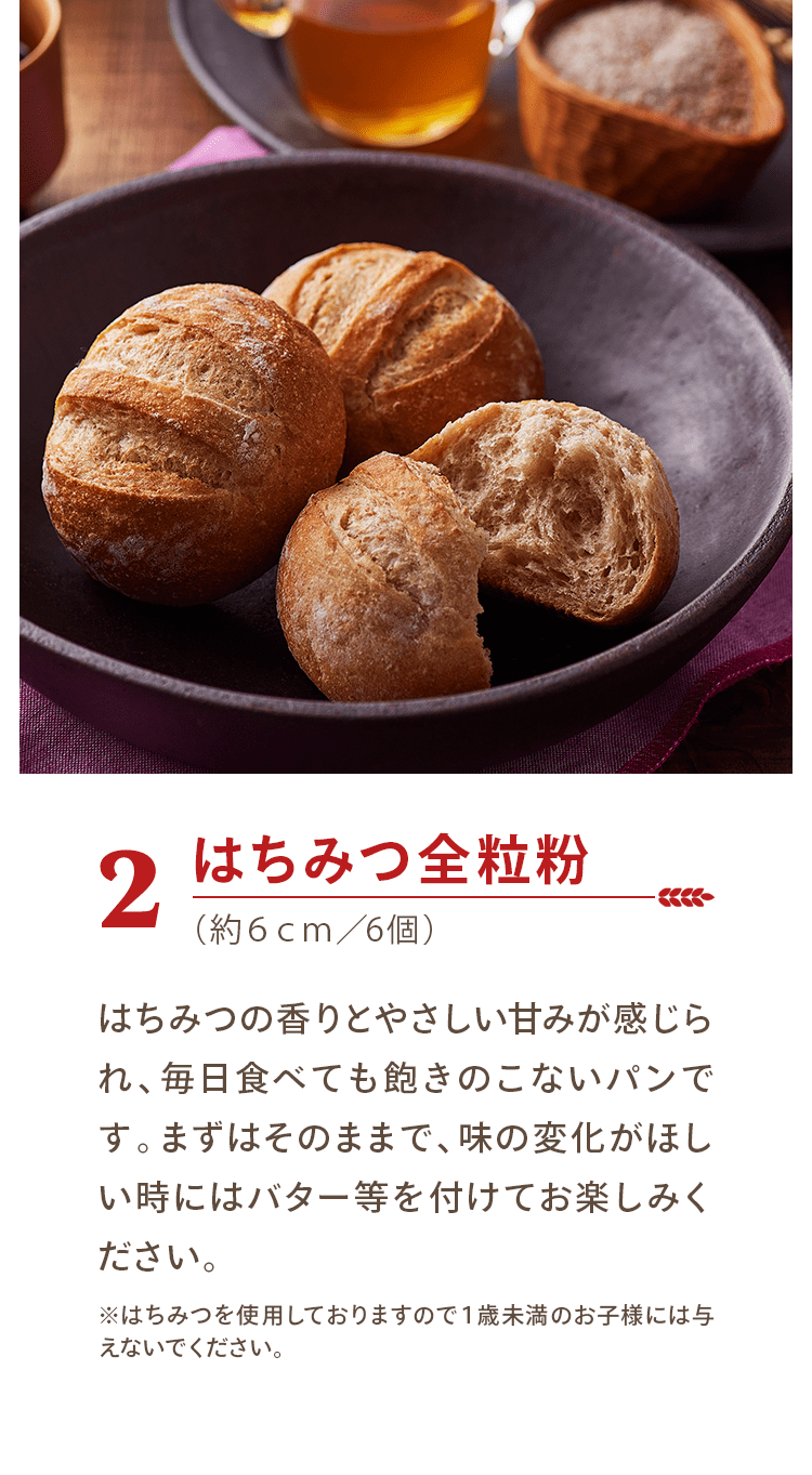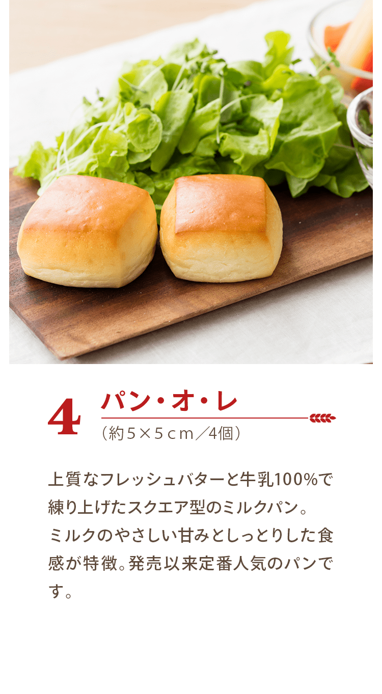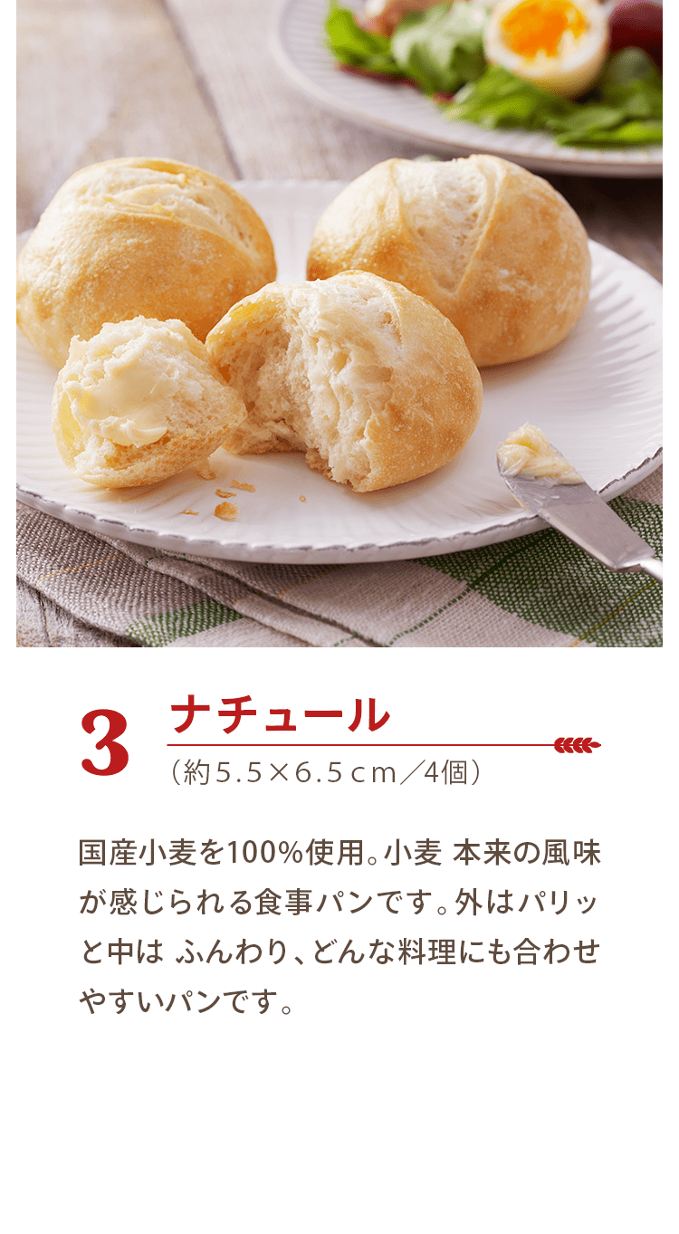 ■原材料 : ■ナチュール(国産小麦パン):小麦粉(国内製造)、菜種油、食塩、パン酵母、砂糖、モルトエキス ■はちみつ全粒粉:小麦粉(国内製造)、豆乳、小麦全粒粉(国内製造)、はちみつ、砂糖、菜種油、パン酵母、食塩、大麦粉、モルトエキス、(一部に小麦・大豆を含む) ■パン・オ・レ:小麦粉(国内製造)、牛乳、グラニュー糖、バター、食塩、パン酵母、卵、モルトエキス、(一部に小麦・乳成分・卵を含む) ■メルティ塩バターパン:小麦粉(国内製造)、バター、砂糖、食塩、パン酵母、モルトエキス、(一部に小麦・乳成分を含む) ■いちじくとクルミのパン:小麦粉(国内製造)、ドライイチジク、くるみ、ライ麦全粒粉、食塩、パン酵母、モルト、上新粉、モルトエキス、(一部に小麦・くるみを含む) ■クルミ・オ・レ:小麦粉(国内製造)、牛乳、くるみ、砂糖、バター、パン酵母、食塩、モルトエキス、(一部に小麦・乳成分・くるみを含む)