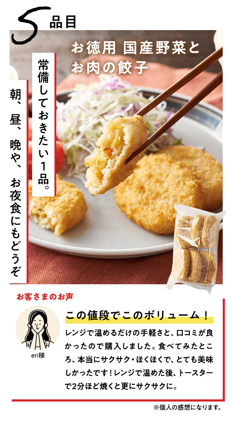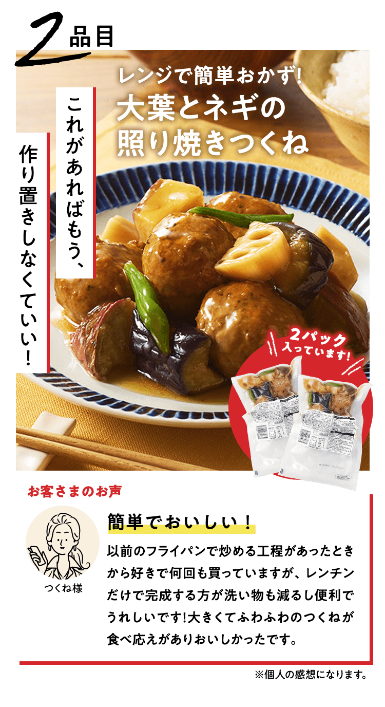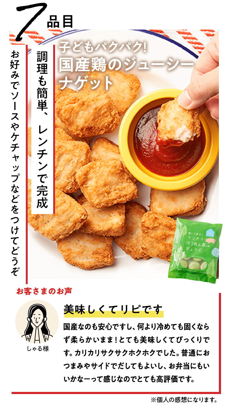 ■原材料 : ■大葉とネギの照り焼きつくね:つくね(鶏肉(国産)、たまねぎ、豚肉、豚脂、植物油脂、ねぎ、パン粉、でん粉、ぶどう糖、粉末状植物性たん白、清酒、砂糖、食塩、大葉、おろししょうが、酵母エキス、粉末濃縮スープ、大豆粉、果実調味料、香辛料)、揚げなす(なす、食塩、揚げ油)、煮物だれ(みりん、醤油、砂糖、水あめ、かつおエキス、醸造酢、酵母エキス、昆布エキス)、さつまいも、れんこん、いんげん、/増粘剤(キサンタン)、(一部に小麦・卵・乳成分・牛肉・大豆・鶏肉・豚肉を含む)■スパイス香るドライカレー:豚ひき肉(国産)、ドライカレーソース(醤油、トマトペースト、動物油脂、砂糖、ガラムマサラ、生姜、にんにく、カレー粉、クミン、食塩、スパイスミックス、唐辛子)、揚げなす(なす、食塩、揚げ油)、トマト、パプリカ(赤・黄)、枝豆、(一部に小麦・牛肉・大豆・豚肉を含む)■子どもパクパク!モッチリ ほうれん草入りぎょうざ:野菜(キャベツ(国産)、ほうれん草(国産)、しょうが)、食肉(豚肉(国産)、鶏肉)、豚脂、粒状大豆たん白、ごま油、しょうゆ、砂糖、食塩、魚しょう、カキエキス、こしょう、皮(小麦粉、グルコマンナン、ほうれん草、なたね油、食塩)、加工デンプン(一部に豚肉・鶏肉・大豆・ごま・小麦を含む)■子どもパクパク!国産鶏のジューシーナゲット:鶏肉(国産)、鶏皮(国産)、粉末状植物性たんぱく(大豆を含む)、パン粉(乳成分を含む)、食塩、砂糖、香辛料、衣(パン粉、小麦粉、米粉、でんぷん、粉末状植物性たんぱく、植物油脂)/重曹、増粘多糖類、加工デンプン、揚げ油(なたね油、パーム油)■フライパンで簡単調理 焼き小籠包:豚肉(国産)、豚煮こごり(国産)、ゼラチン、かきエキス、しょうが、チキンエキス、老酒、ごま油、しょうゆ、砂糖、食塩、みりん、乾しいたけ、ほたてエキス、酵母エキス、こしょう、皮(小麦粉、タピオカでん粉、グルコマンナン、なたね油、食塩)、 (一部に豚肉・牛肉・鶏肉・ゼラチン・えび・小麦・大豆・ごまを含む)■レンジで!北海道産4種野菜のコロッケ:野菜{ばれいしょ(北海道)、とうもろこし(北海道)、にんじん、たまねぎ}、植物油脂、砂糖、生乳、パン粉、食塩、衣(パン粉、小麦粉、植物油脂、米粉)、揚げ油(パーム油、米ぬか油)、(一部に小麦・乳成分・大豆を含む)■国産野菜とお肉の餃子:野菜(キャベツ(国産)、玉ねぎ(国産)、長ねぎ(国産)、にら(国産)、しょうが(国産))、食肉(豚肉(国産)、鶏肉(国産))、豚脂、粒状植物性たん白、砂糖、ごま油、食塩、酵母エキス、粉末しょう油、香辛料、皮(小麦粉、麦芽糖、食塩、植物油脂) / 加工デンプン、乳化剤、(一部に小麦・ごま・大豆・鶏肉・豚肉を含む)