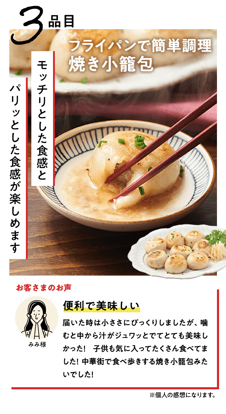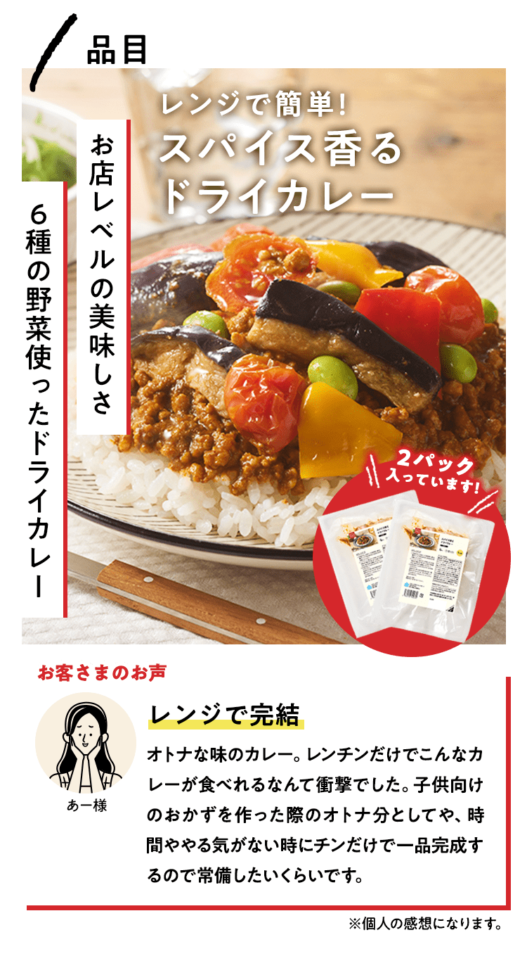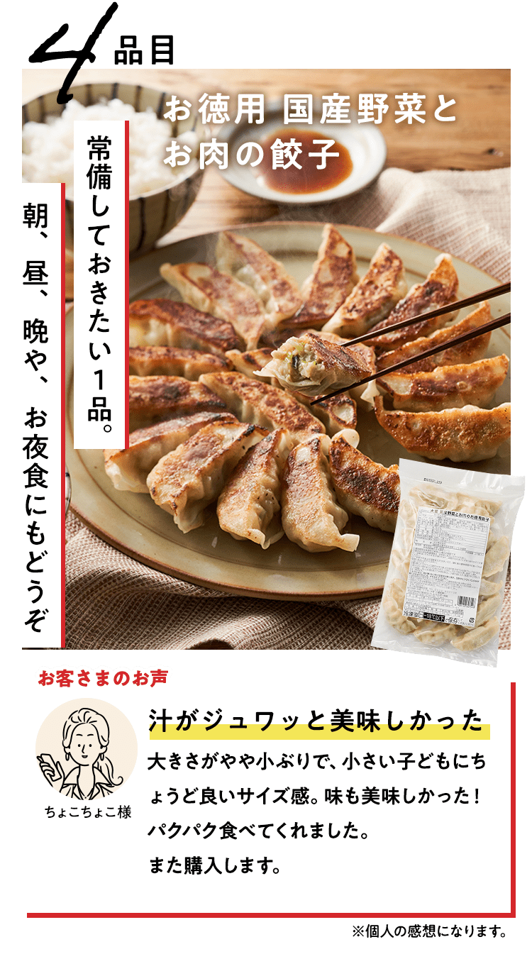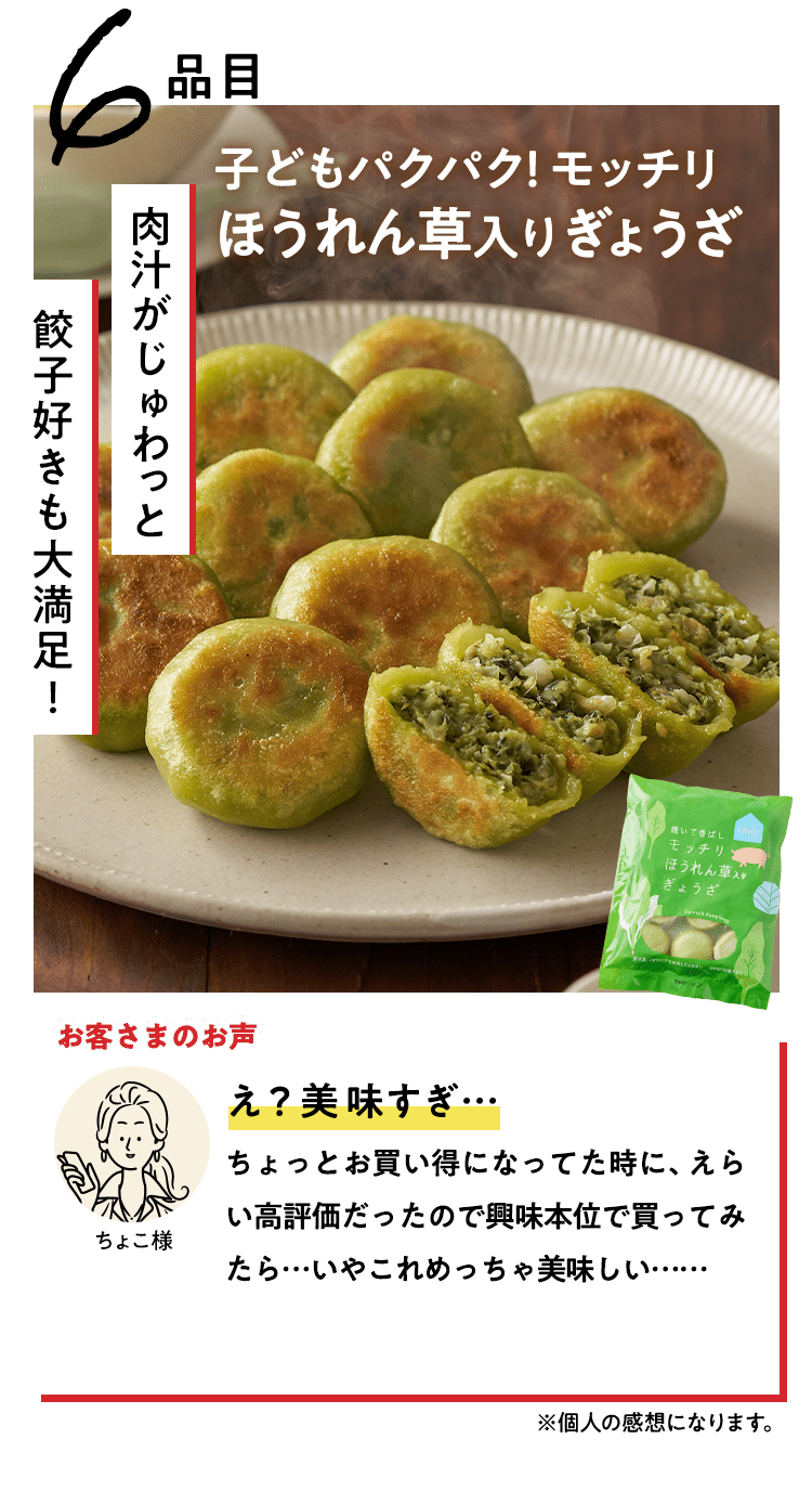 ■原材料 : ■大葉とネギの照り焼きつくね:つくね(鶏肉(国産)、たまねぎ、豚肉、豚脂、植物油脂、ねぎ、パン粉、でん粉、ぶどう糖、粉末状植物性たん白、清酒、砂糖、食塩、大葉、おろししょうが、酵母エキス、粉末濃縮スープ、大豆粉、果実調味料、香辛料)、揚げなす(なす、食塩、揚げ油)、煮物だれ(みりん、醤油、砂糖、水あめ、かつおエキス、醸造酢、酵母エキス、昆布エキス)、さつまいも、れんこん、いんげん、/増粘剤(キサンタン)、(一部に小麦・卵・乳成分・牛肉・大豆・鶏肉・豚肉を含む)■スパイス香るドライカレー:豚ひき肉(国産)、ドライカレーソース(醤油、トマトペースト、動物油脂、砂糖、ガラムマサラ、生姜、にんにく、カレー粉、クミン、食塩、スパイスミックス、唐辛子)、揚げなす(なす、食塩、揚げ油)、トマト、パプリカ(赤・黄)、枝豆、(一部に小麦・牛肉・大豆・豚肉を含む)■子どもパクパク!モッチリ ほうれん草入りぎょうざ:野菜(キャベツ(国産)、ほうれん草(国産)、しょうが)、食肉(豚肉(国産)、鶏肉)、豚脂、粒状大豆たん白、ごま油、しょうゆ、砂糖、食塩、魚しょう、カキエキス、こしょう、皮(小麦粉、グルコマンナン、ほうれん草、なたね油、食塩)、加工デンプン(一部に豚肉・鶏肉・大豆・ごま・小麦を含む)■子どもパクパク!国産鶏のジューシーナゲット:鶏肉(国産)、鶏皮(国産)、粉末状植物性たんぱく(大豆を含む)、パン粉(乳成分を含む)、食塩、砂糖、香辛料、衣(パン粉、小麦粉、米粉、でんぷん、粉末状植物性たんぱく、植物油脂)/重曹、増粘多糖類、加工デンプン、揚げ油(なたね油、パーム油)■フライパンで簡単調理 焼き小籠包:豚肉(国産)、豚煮こごり(国産)、ゼラチン、かきエキス、しょうが、チキンエキス、老酒、ごま油、しょうゆ、砂糖、食塩、みりん、乾しいたけ、ほたてエキス、酵母エキス、こしょう、皮(小麦粉、タピオカでん粉、グルコマンナン、なたね油、食塩)、 (一部に豚肉・牛肉・鶏肉・ゼラチン・えび・小麦・大豆・ごまを含む)■レンジで!北海道産4種野菜のコロッケ:野菜{ばれいしょ(北海道)、とうもろこし(北海道)、にんじん、たまねぎ}、植物油脂、砂糖、生乳、パン粉、食塩、衣(パン粉、小麦粉、植物油脂、米粉)、揚げ油(パーム油、米ぬか油)、(一部に小麦・乳成分・大豆を含む)■国産野菜とお肉の餃子:野菜(キャベツ(国産)、玉ねぎ(国産)、長ねぎ(国産)、にら(国産)、しょうが(国産))、食肉(豚肉(国産)、鶏肉(国産))、豚脂、粒状植物性たん白、砂糖、ごま油、食塩、酵母エキス、粉末しょう油、香辛料、皮(小麦粉、麦芽糖、食塩、植物油脂) / 加工デンプン、乳化剤、(一部に小麦・ごま・大豆・鶏肉・豚肉を含む)