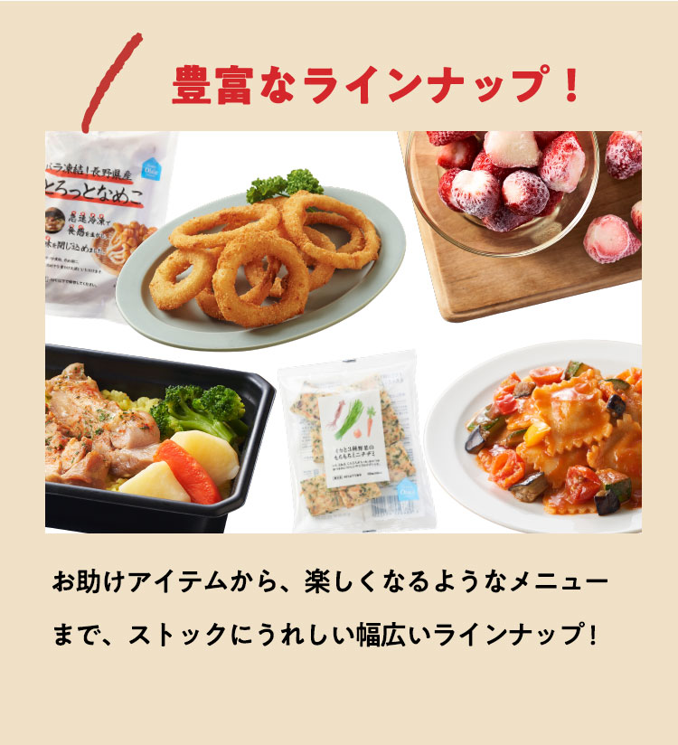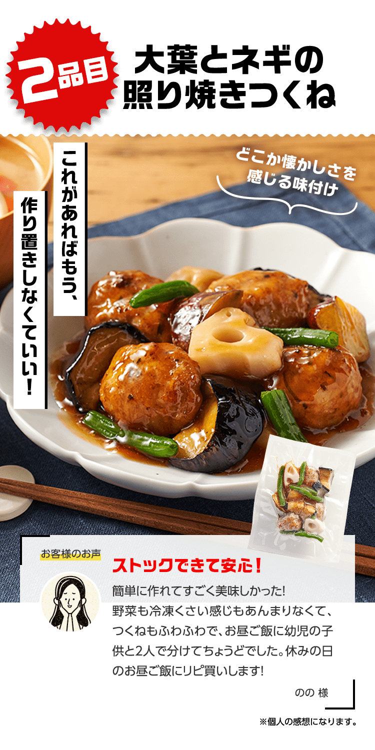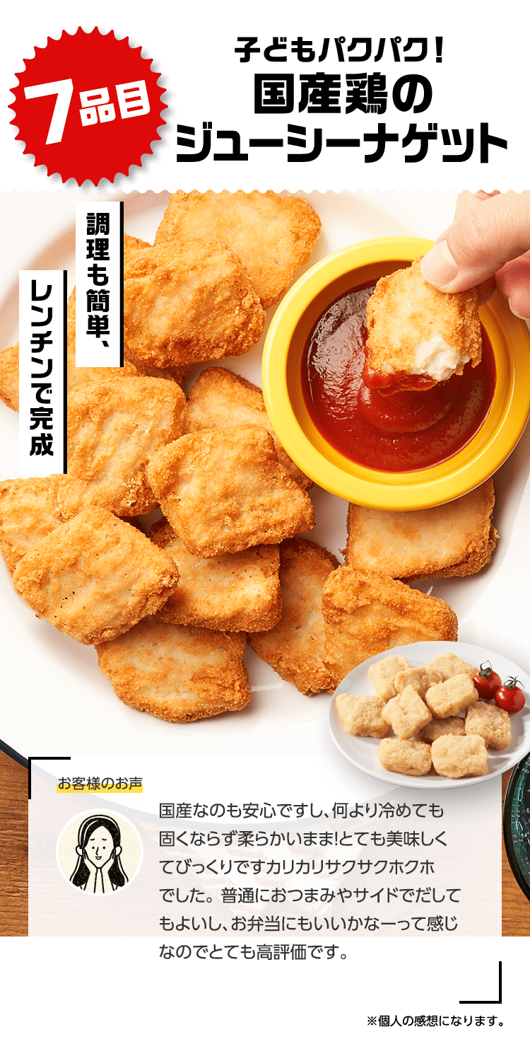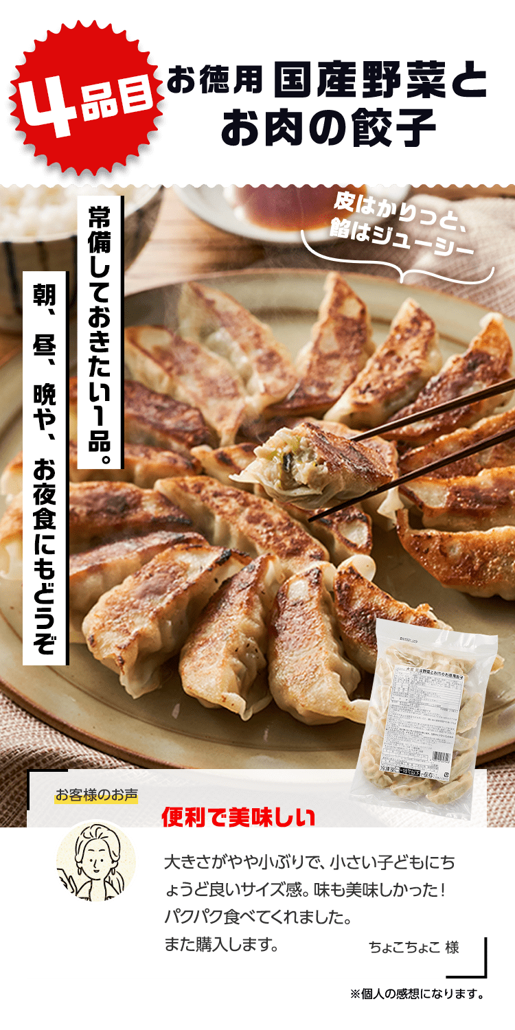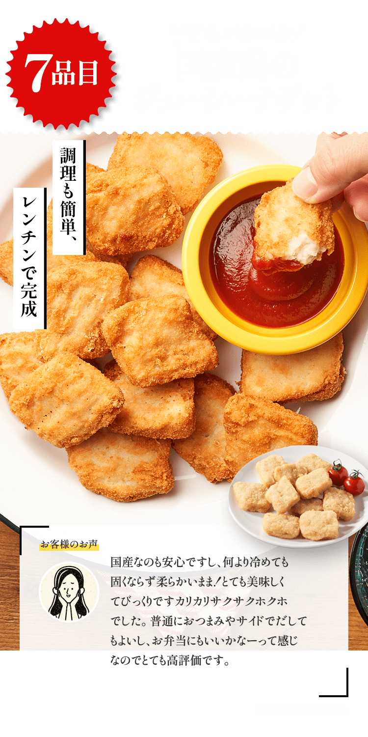 ■原材料 : ■大葉とネギの照り焼きつくね:つくね(鶏肉(国産)、玉ねぎ、豚肉、豚脂、植物油脂、ねぎ、パン粉、でん粉、ぶどう糖、粉末状植物性たん白、清酒、砂糖、食塩、大葉、おろししょうが、酵母エキス、粉末濃縮スープ、大豆粉、果実調味料、香辛料)、揚げなす(なす、食塩、植物油(大豆油))、煮物だれ(みりん、醤油、砂糖、水飴、鰹エキス、醸造酢、酵母エキス、昆布エキス)、さつまいも、れんこん、インゲン/増粘剤(キサンタン)、(一部に小麦・卵・乳成分を含む) ■スパイス香るドライカレー:豚ひき肉(千葉県産)、野菜ミックス(ズッキーニ、なす、赤パプリカ、黄パプリカ、パーム油、食塩)、ドライカレーソース(醤油、トマトペースト、動物油脂、砂糖、ガラムマサラ、生姜、にんにく、カレー粉、クミン、食塩、スパイスミックス、唐辛子)、トマト、枝豆、(一部に小麦を含む) ■子どもパクパク!モッチリ ほうれん草入りぎょうざ:野菜(キャベツ(国産)、ほうれん草(国産)、しょうが)、食肉(豚肉(国産)、鶏肉)、豚脂、粒状大豆たん白、ごま油、しょうゆ、砂糖、食塩、魚しょう、カキエキス、こしょう、皮(小麦粉、グルコマンナン、ほうれん草、なたね油、食塩)、加工デンプン ■子どもパクパク!国産鶏のジューシーナゲット:鶏肉(国産)、鶏皮(国産)、粉末状植物性たんぱく(大豆を含む)、パン粉(乳成分を含む)、食塩、砂糖、香辛料、衣(パン粉、小麦粉、米粉、でんぷん、粉末状植物性たんぱく、植物油脂)/重曹、増粘多糖類、加工デンプン、揚げ油(なたね油、パーム油) ■フライパンで簡単調理 焼き小籠包:豚肉(国産)、豚煮こごり(国産)、ゼラチン、かきエキス、しょうが、チキンエキス、老酒、ごま油、しょうゆ、砂糖、食塩、みりん、乾しいたけ、ほたてエキス、酵母エキス、こしょう、皮(小麦粉、タピオカでん粉、グルコマンナン、なたね油、食塩)、 (一部に豚肉・牛肉・鶏肉・ゼラチン・えび・小麦・大豆・ごまを含む) ■レンジで!北海道産4種野菜のコロッケ:野菜{ばれいしょ(北海道)、とうもろこし(北海道)、にんじん、たまねぎ}、植物油脂、砂糖、生乳、パン粉、食塩、衣(パン粉、小麦粉、植物油脂、米粉)、揚げ油(パーム油、米ぬか油)、(一部に小麦・乳成分・大豆を含む) ■お徳用 国産野菜とお肉の餃子:野菜(キャベツ(国産)、玉ねぎ(国産)、長ねぎ(国産)、にら(国産)、しょうが(国産))、食肉(豚肉(国産)、鶏肉(国産))、豚脂、粒状植物性たん白、砂糖、ごま油、食塩、酵母エキス、粉末しょう油、香辛料、皮(小麦粉、麦芽糖、食塩、植物油脂) / 加工デンプン、乳化剤、(一部に小麦・ごま・大豆・鶏肉・豚肉を含む)