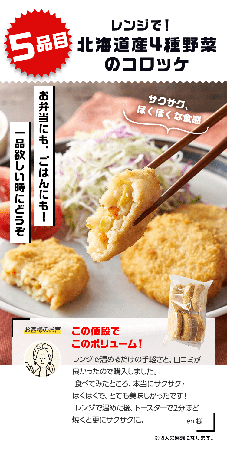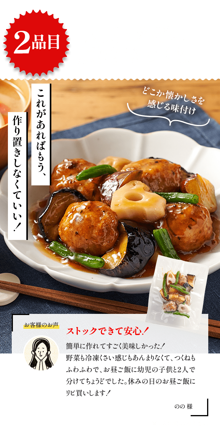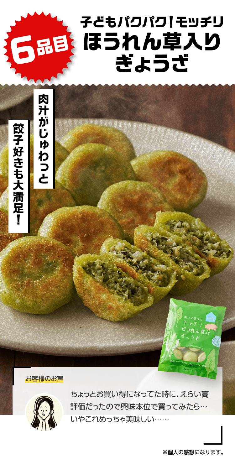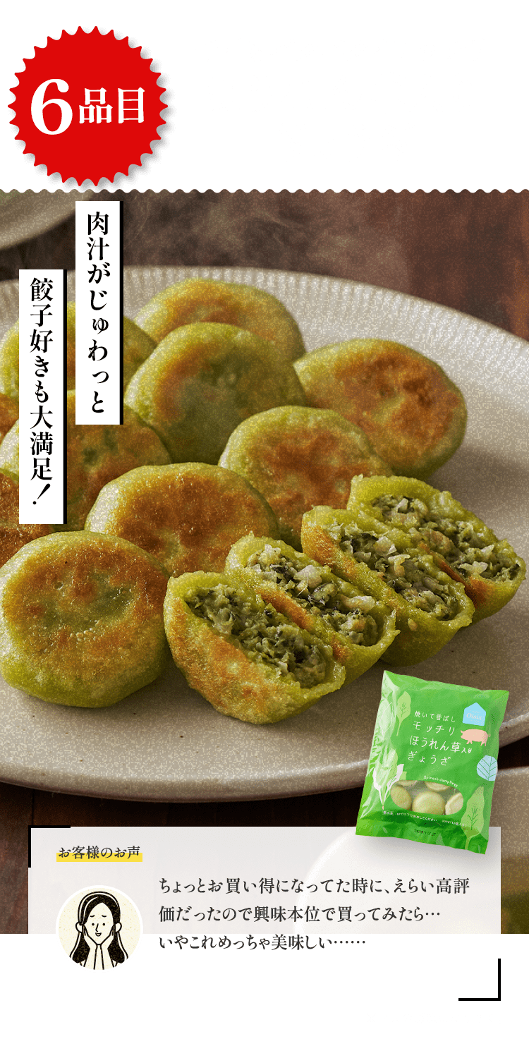 ■原材料 : ■大葉とネギの照り焼きつくね:つくね(鶏肉(国産)、玉ねぎ、豚肉、豚脂、植物油脂、ねぎ、パン粉、でん粉、ぶどう糖、粉末状植物性たん白、清酒、砂糖、食塩、大葉、おろししょうが、酵母エキス、粉末濃縮スープ、大豆粉、果実調味料、香辛料)、揚げなす(なす、食塩、植物油(大豆油))、煮物だれ(みりん、醤油、砂糖、水飴、鰹エキス、醸造酢、酵母エキス、昆布エキス)、さつまいも、れんこん、インゲン/増粘剤(キサンタン)、(一部に小麦・卵・乳成分を含む) ■スパイス香るドライカレー:豚ひき肉(千葉県産)、野菜ミックス(ズッキーニ、なす、赤パプリカ、黄パプリカ、パーム油、食塩)、ドライカレーソース(醤油、トマトペースト、動物油脂、砂糖、ガラムマサラ、生姜、にんにく、カレー粉、クミン、食塩、スパイスミックス、唐辛子)、トマト、枝豆、(一部に小麦を含む) ■子どもパクパク!モッチリ ほうれん草入りぎょうざ:野菜(キャベツ(国産)、ほうれん草(国産)、しょうが)、食肉(豚肉(国産)、鶏肉)、豚脂、粒状大豆たん白、ごま油、しょうゆ、砂糖、食塩、魚しょう、カキエキス、こしょう、皮(小麦粉、グルコマンナン、ほうれん草、なたね油、食塩)、加工デンプン ■子どもパクパク!国産鶏のジューシーナゲット:鶏肉(国産)、鶏皮(国産)、粉末状植物性たんぱく(大豆を含む)、パン粉(乳成分を含む)、食塩、砂糖、香辛料、衣(パン粉、小麦粉、米粉、でんぷん、粉末状植物性たんぱく、植物油脂)/重曹、増粘多糖類、加工デンプン、揚げ油(なたね油、パーム油) ■フライパンで簡単調理 焼き小籠包:豚肉(国産)、豚煮こごり(国産)、ゼラチン、かきエキス、しょうが、チキンエキス、老酒、ごま油、しょうゆ、砂糖、食塩、みりん、乾しいたけ、ほたてエキス、酵母エキス、こしょう、皮(小麦粉、タピオカでん粉、グルコマンナン、なたね油、食塩)、 (一部に豚肉・牛肉・鶏肉・ゼラチン・えび・小麦・大豆・ごまを含む) ■レンジで!北海道産4種野菜のコロッケ:野菜{ばれいしょ(北海道)、とうもろこし(北海道)、にんじん、たまねぎ}、植物油脂、砂糖、生乳、パン粉、食塩、衣(パン粉、小麦粉、植物油脂、米粉)、揚げ油(パーム油、米ぬか油)、(一部に小麦・乳成分・大豆を含む) ■お徳用 国産野菜とお肉の餃子:野菜(キャベツ(国産)、玉ねぎ(国産)、長ねぎ(国産)、にら(国産)、しょうが(国産))、食肉(豚肉(国産)、鶏肉(国産))、豚脂、粒状植物性たん白、砂糖、ごま油、食塩、酵母エキス、粉末しょう油、香辛料、皮(小麦粉、麦芽糖、食塩、植物油脂) / 加工デンプン、乳化剤、(一部に小麦・ごま・大豆・鶏肉・豚肉を含む)