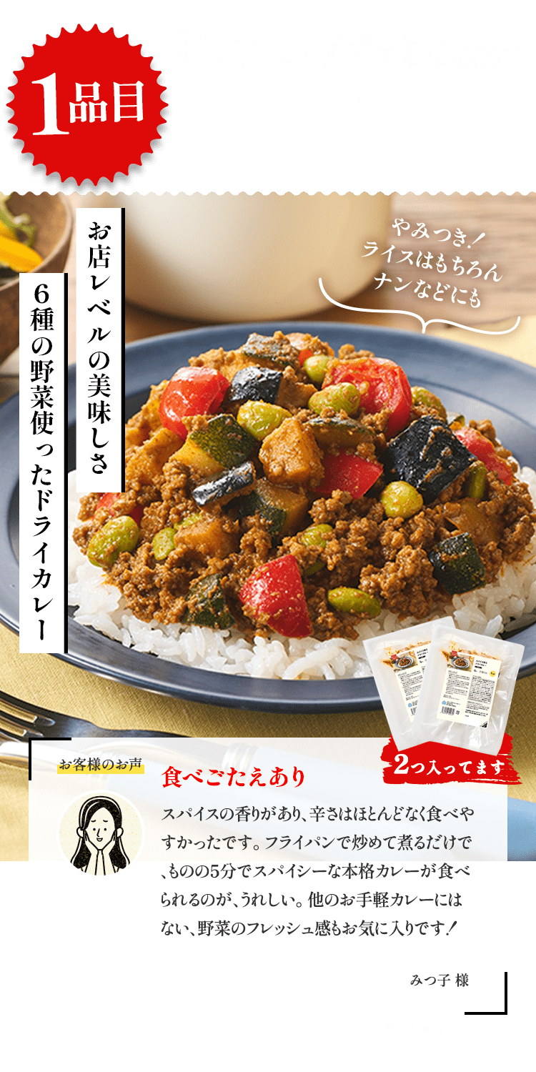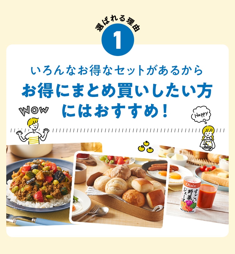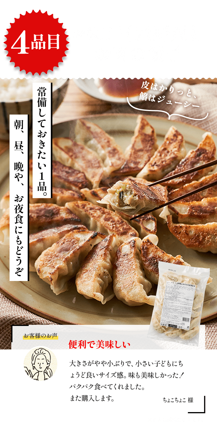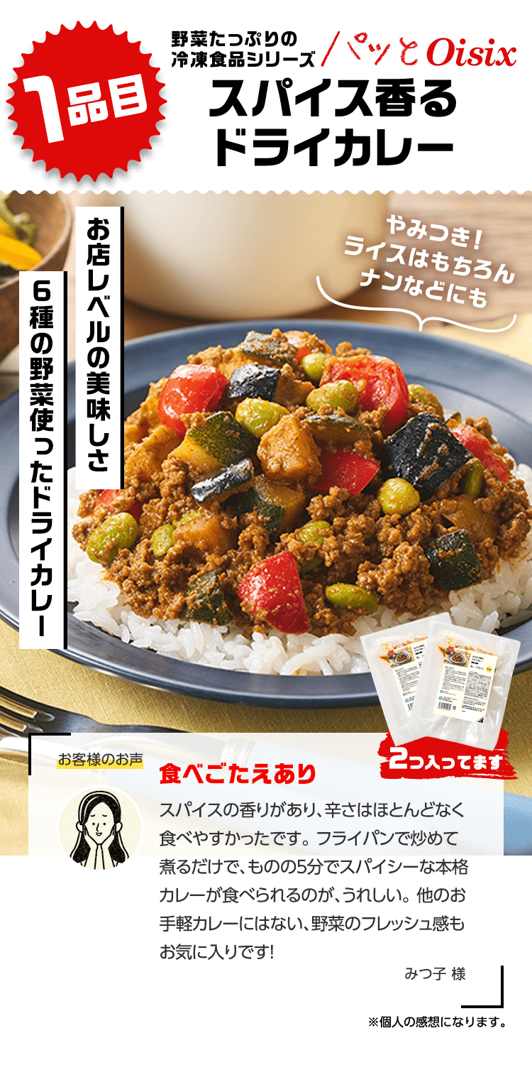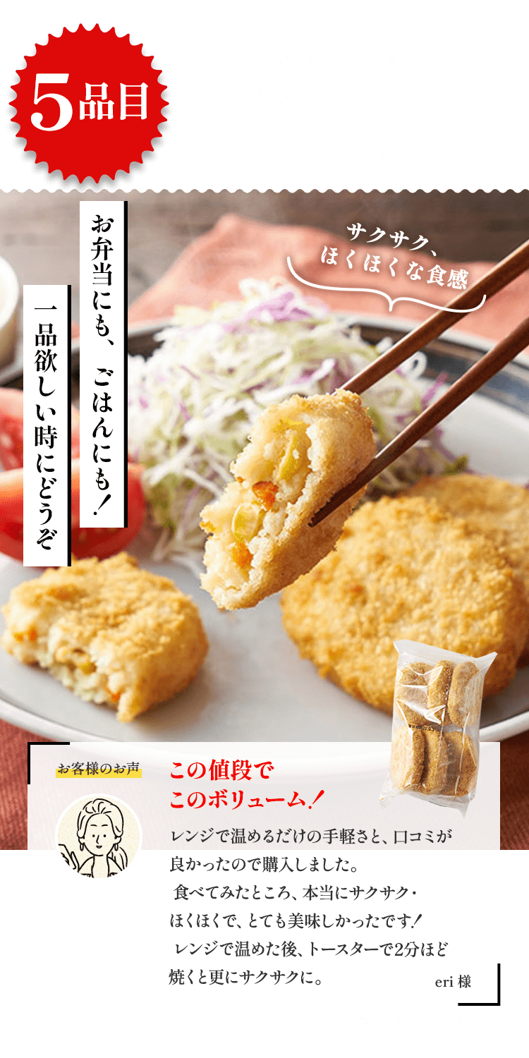 ■原材料 : ■大葉とネギの照り焼きつくね:つくね(鶏肉(国産)、玉ねぎ、豚肉、豚脂、植物油脂、ねぎ、パン粉、でん粉、ぶどう糖、粉末状植物性たん白、清酒、砂糖、食塩、大葉、おろししょうが、酵母エキス、粉末濃縮スープ、大豆粉、果実調味料、香辛料)、揚げなす(なす、食塩、植物油(大豆油))、煮物だれ(みりん、醤油、砂糖、水飴、鰹エキス、醸造酢、酵母エキス、昆布エキス)、さつまいも、れんこん、インゲン/増粘剤(キサンタン)、(一部に小麦・卵・乳成分を含む) ■スパイス香るドライカレー:豚ひき肉(千葉県産)、野菜ミックス(ズッキーニ、なす、赤パプリカ、黄パプリカ、パーム油、食塩)、ドライカレーソース(醤油、トマトペースト、動物油脂、砂糖、ガラムマサラ、生姜、にんにく、カレー粉、クミン、食塩、スパイスミックス、唐辛子)、トマト、枝豆、(一部に小麦を含む) ■子どもパクパク!モッチリ ほうれん草入りぎょうざ:野菜(キャベツ(国産)、ほうれん草(国産)、しょうが)、食肉(豚肉(国産)、鶏肉)、豚脂、粒状大豆たん白、ごま油、しょうゆ、砂糖、食塩、魚しょう、カキエキス、こしょう、皮(小麦粉、グルコマンナン、ほうれん草、なたね油、食塩)、加工デンプン ■子どもパクパク!国産鶏のジューシーナゲット:鶏肉(国産)、鶏皮(国産)、粉末状植物性たんぱく(大豆を含む)、パン粉(乳成分を含む)、食塩、砂糖、香辛料、衣(パン粉、小麦粉、米粉、でんぷん、粉末状植物性たんぱく、植物油脂)/重曹、増粘多糖類、加工デンプン、揚げ油(なたね油、パーム油) ■フライパンで簡単調理 焼き小籠包:豚肉(国産)、豚煮こごり(国産)、ゼラチン、かきエキス、しょうが、チキンエキス、老酒、ごま油、しょうゆ、砂糖、食塩、みりん、乾しいたけ、ほたてエキス、酵母エキス、こしょう、皮(小麦粉、タピオカでん粉、グルコマンナン、なたね油、食塩)、 (一部に豚肉・牛肉・鶏肉・ゼラチン・えび・小麦・大豆・ごまを含む) ■レンジで!北海道産4種野菜のコロッケ:野菜{ばれいしょ(北海道)、とうもろこし(北海道)、にんじん、たまねぎ}、植物油脂、砂糖、生乳、パン粉、食塩、衣(パン粉、小麦粉、植物油脂、米粉)、揚げ油(パーム油、米ぬか油)、(一部に小麦・乳成分・大豆を含む) ■お徳用 国産野菜とお肉の餃子:野菜(キャベツ(国産)、玉ねぎ(国産)、長ねぎ(国産)、にら(国産)、しょうが(国産))、食肉(豚肉(国産)、鶏肉(国産))、豚脂、粒状植物性たん白、砂糖、ごま油、食塩、酵母エキス、粉末しょう油、香辛料、皮(小麦粉、麦芽糖、食塩、植物油脂) / 加工デンプン、乳化剤、(一部に小麦・ごま・大豆・鶏肉・豚肉を含む)