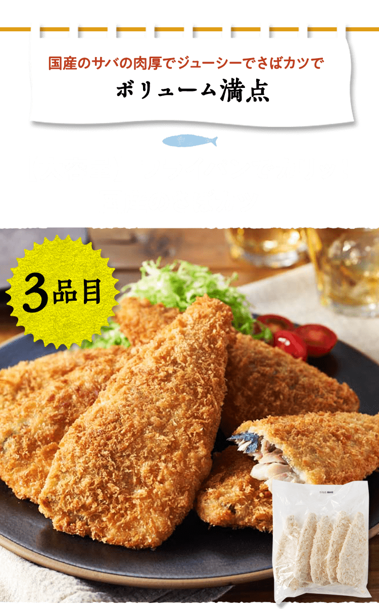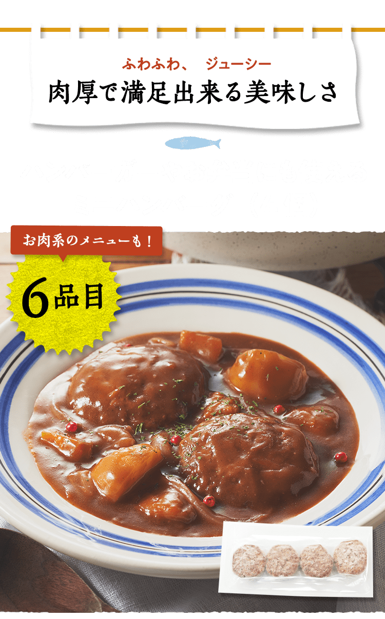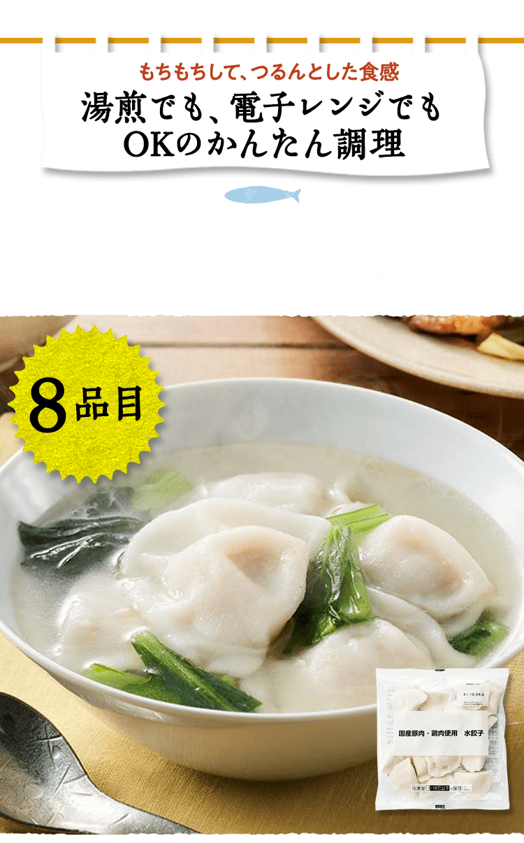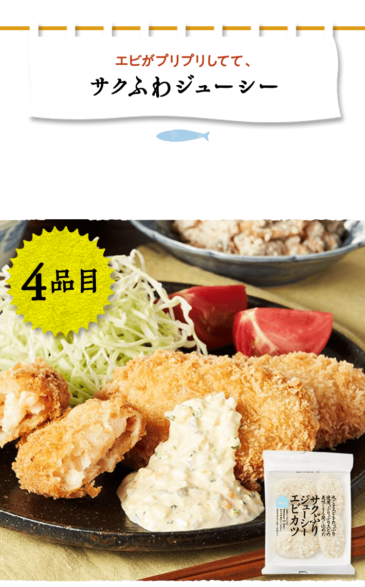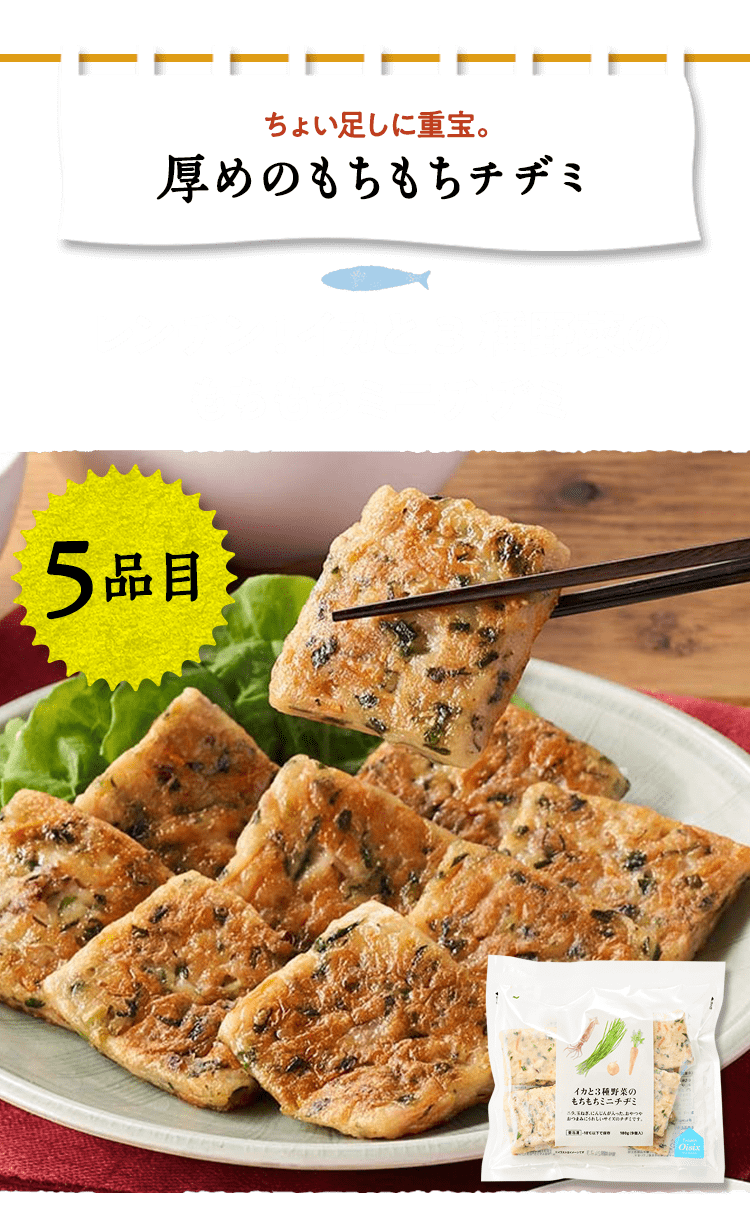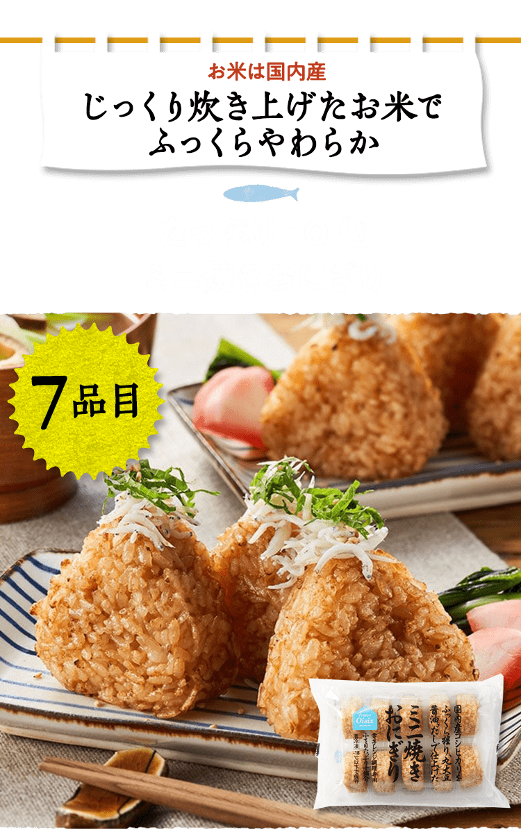 ■原材料 : ■イカと3種野菜のミニチヂミ:ニラ(インドネシア産)、にんじん(国産)、玉ねぎ(国産)、魚肉すり身(いとよりだい、砂糖)、イカ、豚脂、植物油脂(大豆油、ごま油)、粉末状大豆たん白、鶏卵、ごま、食塩、醤油、ぶどう糖、えび粉、砂糖/加工でん粉、(一部にえび・小麦・卵・イカ・ごま・大豆・豚肉を含む)■サクぷりジューシーエビカツ:えび(ベトナム産またはインドネシア産)、すり身(スケトウダラ)、玉ねぎ、砂糖、でん粉、植物油脂、小麦粉、えびパウダー、食塩、酵母エキス、魚醤パウダー、大豆粉、衣(パン粉、乾燥パン粉、小麦粉、でん粉、砂糖、食塩、酵母エキス、香辛料、鶏卵、脱脂粉乳)、(一部に卵・乳成分・小麦・えび・大豆を含む)■ミニハンバーグ(4個):食肉〔牛肉(オーストラリア)、鶏肉)、たまねぎ、つなぎ(パン粉、鶏卵、牛乳、でん粉)、豚肉調製品(豚肉、香辛料)、牛脂、香辛料、食塩、食物繊維、トマトペースト/香料、カロチノイド色素、(一部に小麦・卵・乳成分・牛肉・大豆・鶏肉・豚肉を含む)■レンジで簡単!あっさりパクパク水餃子:皮(小麦粉(国内製造)、粉末状小麦たん白、食塩、大豆粉、なたね油)、食肉(豚肉(国産)、鶏肉(国産))、野菜(キャベツ(国産)、玉ねぎ、しょうが)、豚脂、つなぎ(パン粉、卵白粉)、粒状大豆たん白、粉ゼラチン、ガラスープ、しょう油、ごま油、食塩、ポークエキス、砂糖、老酒、オイスターソース、酵母エキス、香辛料、エビエキス / 加工デンプン、増粘多糖類、乳化剤、カイワレダイコン抽出液、(一部にえび・小麦・卵・ごま・大豆・鶏肉・豚肉・ゼラチン・魚醤(魚介類)を含む)■たっぷり10個ミニ焼きおにぎり:米(国産)、しょうゆ、かつおエキス、こんぶだし、食塩、砂糖、植物油脂、果糖ぶどう糖液糖、デキストリン、酵母エキス/加工でん粉、(一部に小麦・大豆を含む)■国産のさばカツ:さば(国産)、衣(パン粉、小麦粉、食塩、でん粉、粉末状大豆たん白、大豆粉、植物油脂)/加工デンプン、乳化剤、増粘多糖類、(一部に小麦・さば・大豆を含む)■生から作ったアジフィーレフライ:真鯵(長崎県産)、衣(パン粉、バッターミックス粉(大麦粉、でん粉、小麦粉)、打ち粉(でん粉、小麦粉、大豆粉))、(一部に小麦・大豆を含む)■海老野菜のガーリックトマト:むきえび(ベトナム製造)(えび(ベトナム産)、食塩)、揚げなす(なす、食塩、揚げ油(パーム油脂))、ブロッコリー、ソース(トマトペースト、たまねぎ、にんじん、植物油脂、チキンコンソメ、砂糖、にんにく、香辛料)、トマト/pH調整剤、(一部にえび・大豆・鶏肉・豚肉を含む)