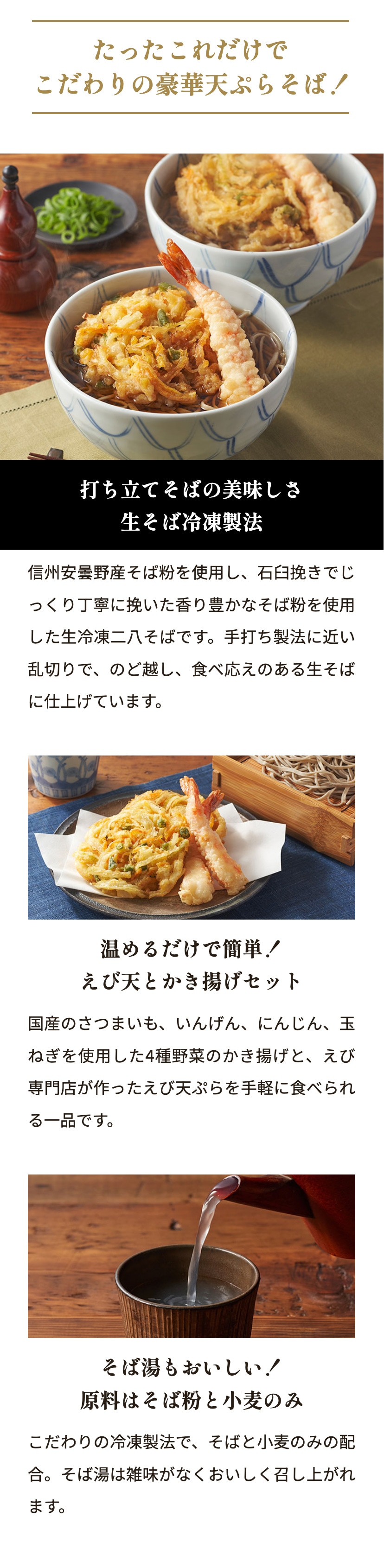 - 【信州安曇野産そば粉使用 石臼挽き二八そば】めん[そば粉(そば(長野県安曇野産))、小麦粉、小麦たん白、打粉(そば粉)、そばの葉粉末] つゆ(希釈用)[しょうゆ(小麦・大豆を含む)、みりん、砂糖、食塩、酵母エキスパウダー、かつおぶしエキス(小麦を含む)、さばぶしエキス、煮干しエキス / 酒精、着色料(カラメル)] 【えび天と野菜かき揚げ セット4個】野菜かき揚げ:玉ねぎ(国産)、人参(国産)、いんげん(国産)、さつまいも(国産)、小麦粉、コーンフラワー、でん粉、小麦全粒粉、ぶどう糖、植物性たん白、衣(小麦粉、コーンフラワー、でん粉、小麦全粒粉、鶏卵、脱脂粉乳、えびパウダー、ぶどう糖、植物性たん白)、揚げ油(なたね油、パーム油)、(一部に卵・乳成分・小麦・えび・大豆を含む) えび天:えび(ミャンマー産またはエクアドル産)、衣(小麦粉、でん粉、食塩、大豆粉)、揚げ油(なたね油、パーム油)、(一部に小麦・えび・大豆を含む) 添加物:野菜かき揚げ:膨張剤、乳化剤、カロチン色素、えび天:膨張剤