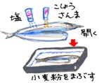さんまは開いて、塩、こしょうで下味をつけ、小麦粉をまぶします。