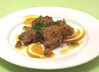 器に揚げた鶏肉を盛り、オレンジソースをかけます。