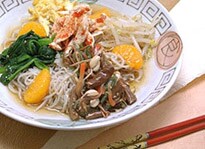 麺を盛った器に、ささみ、ほうれんそう、もやし、山菜ナムル、あらかじめ作っておいた錦糸卵、みかんを彩りよく盛りつけ、スープをかけます。